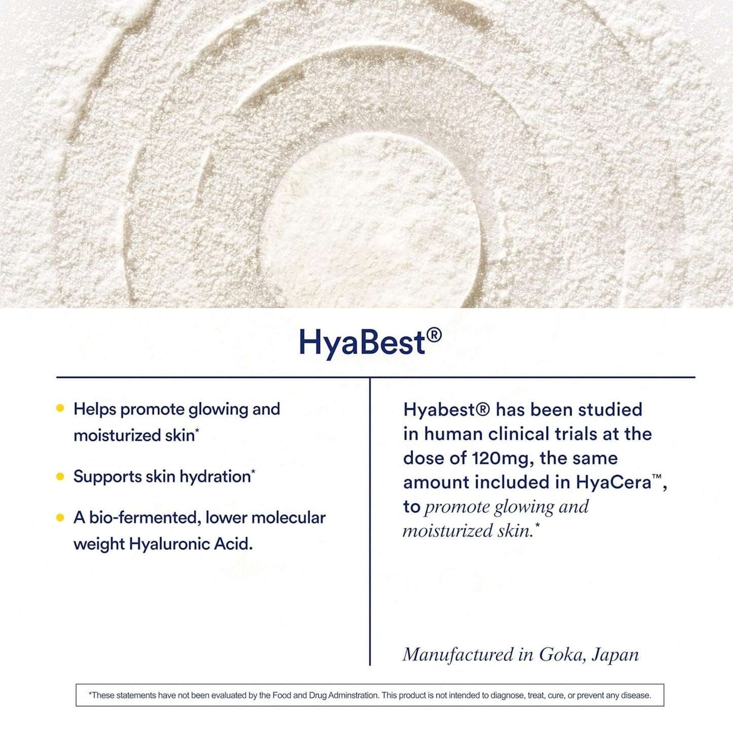 A bio-fermented, lower molecular weight Hyaluronic Acid to help promote glowing and moisturized skin.* We include Hyabest, a hyaluronic acid with a lower molecular weight and clinical insights for skin support and at a dosage of 120mg.*