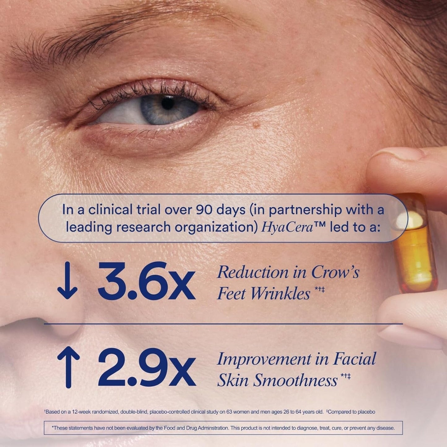• IN A CLINICAL TRIAL OVER 90 DAYS: HyaCera reduced crow’s feet wrinkles by 3.6x and improved skin smoothness by 2.9x.*Based on a 12-week randomized, double-blind, placebo-controlled clinical study on 63 women and men ages 26 to 64 years old. Compared to placebo.