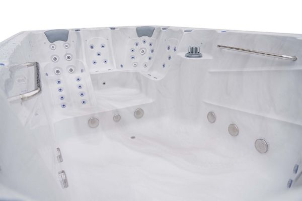 The Platinum Swim 1 combines a larger pool area with a hydrotherapy seating zone. It uses a high-output pump setup to support both the swim spa function and the massage experience, with stainless-steel jets designed to help ease muscle tension and promote relaxation.